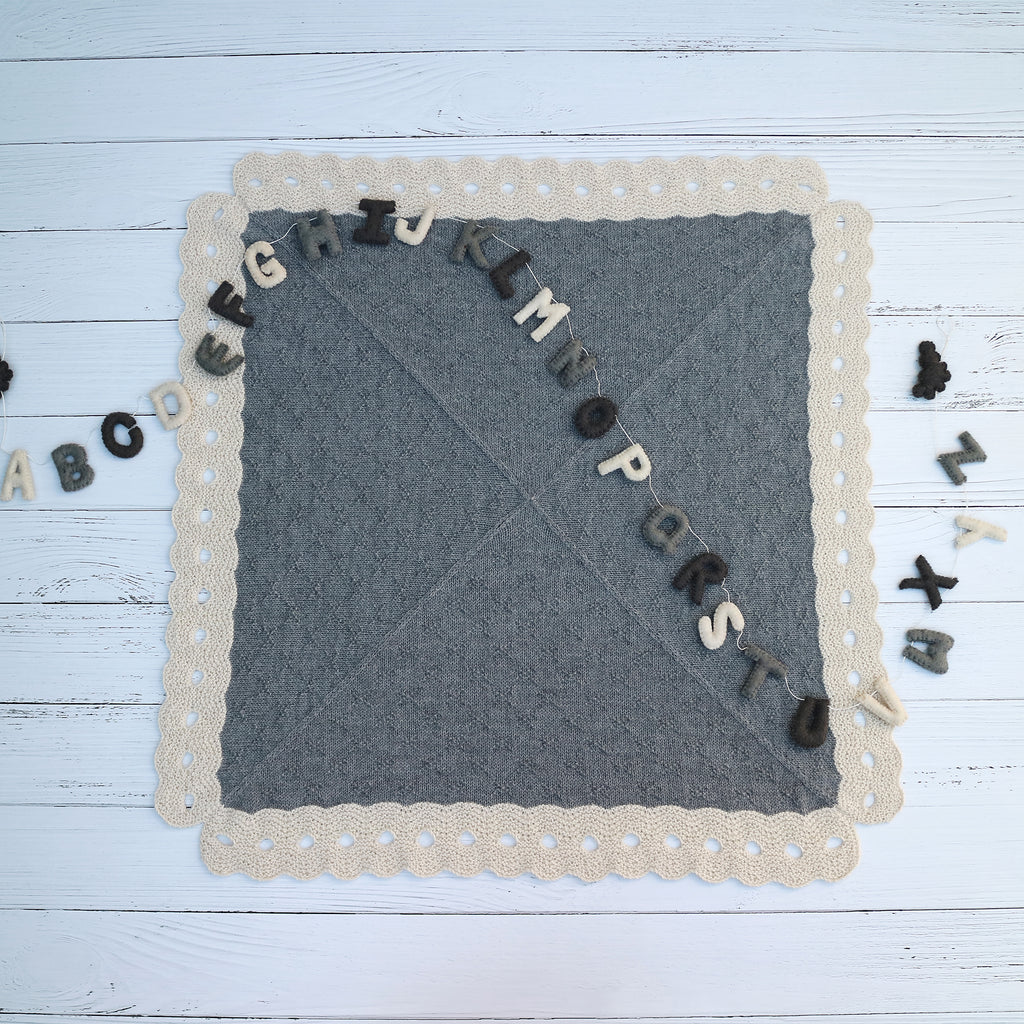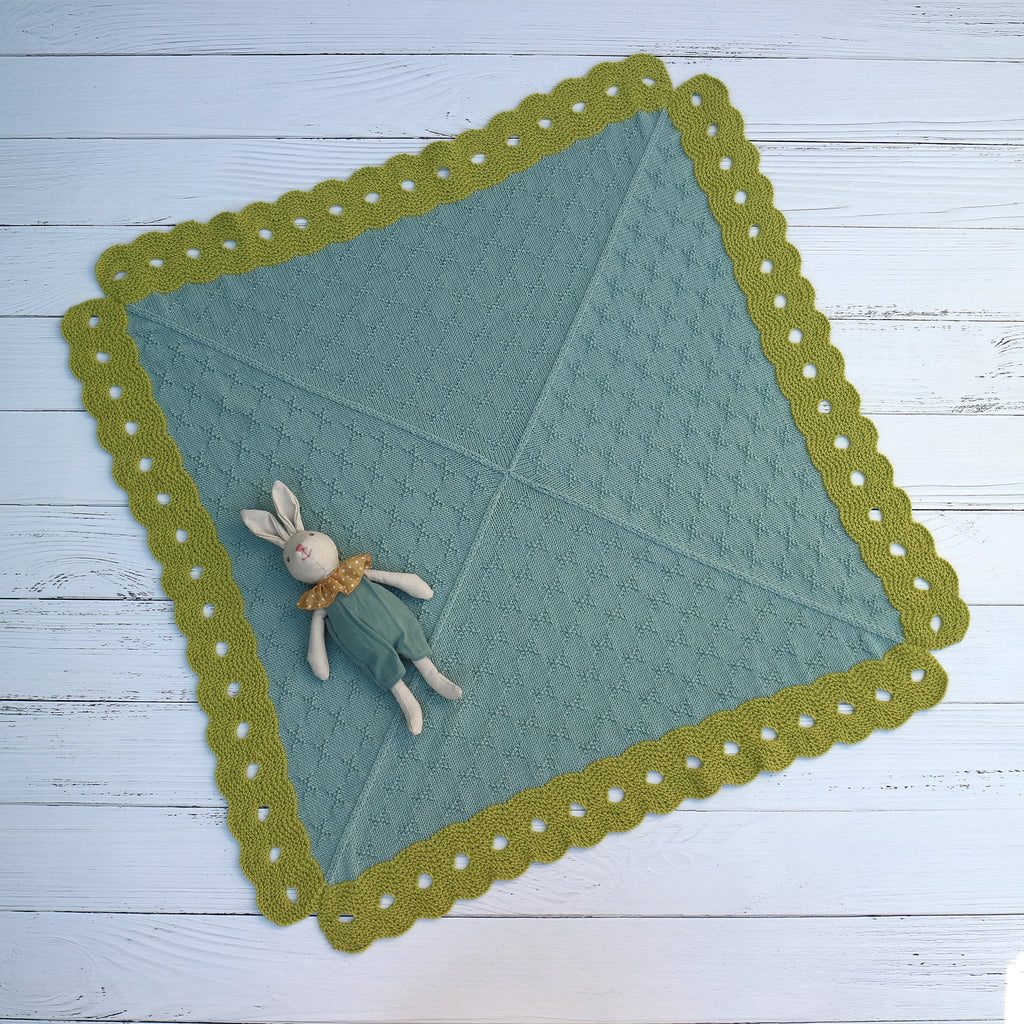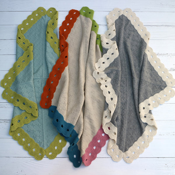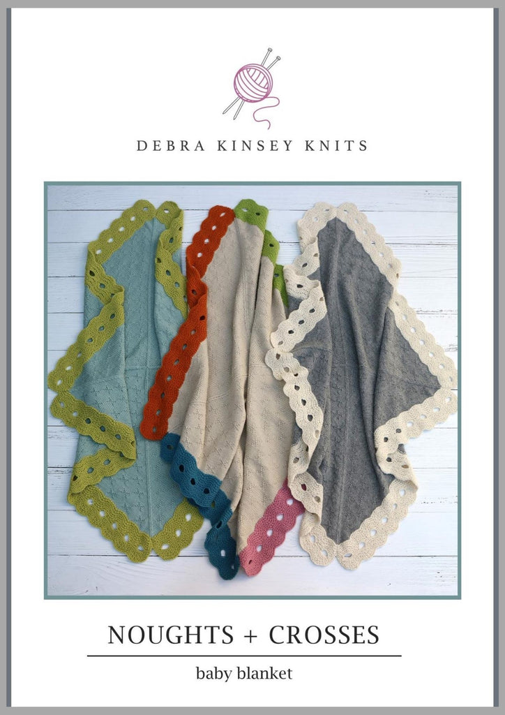 The edging of 'noughts' is a modified feater and fan stitch patten with stitches cast off and cast on to create large holes. The textured pattern of simple crosses is worked into the shaping sequence and is easily memorised. The fashioned decreasing worked along the sides creates an easy sewing edge, perfect for mattress stitch.