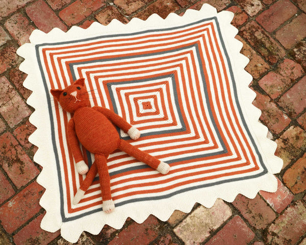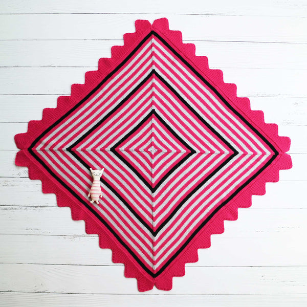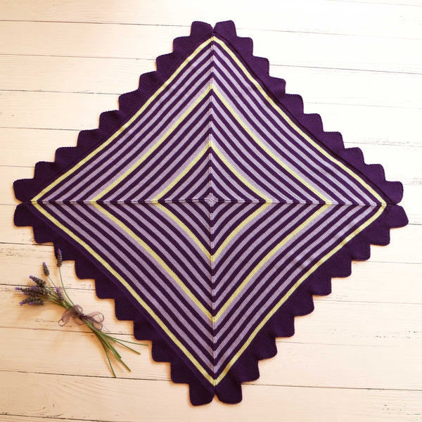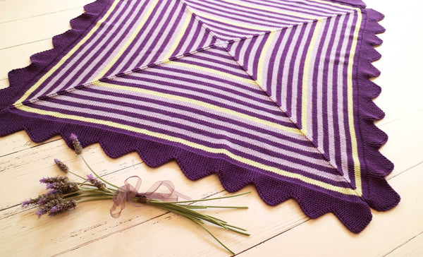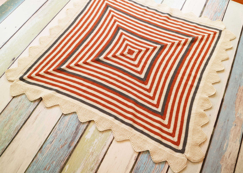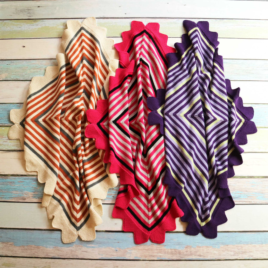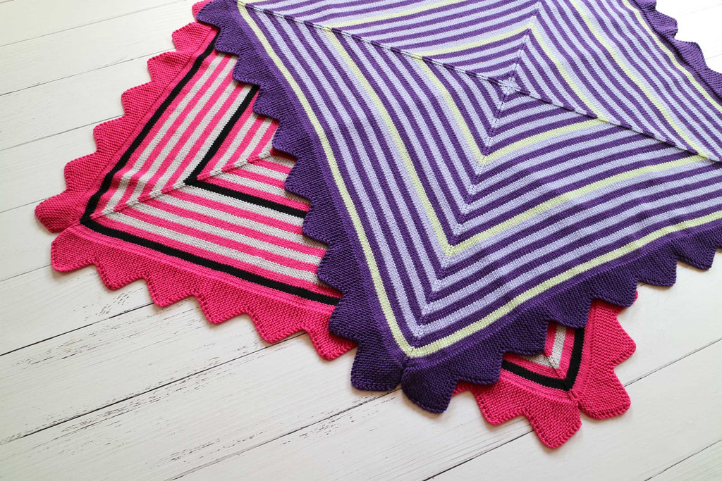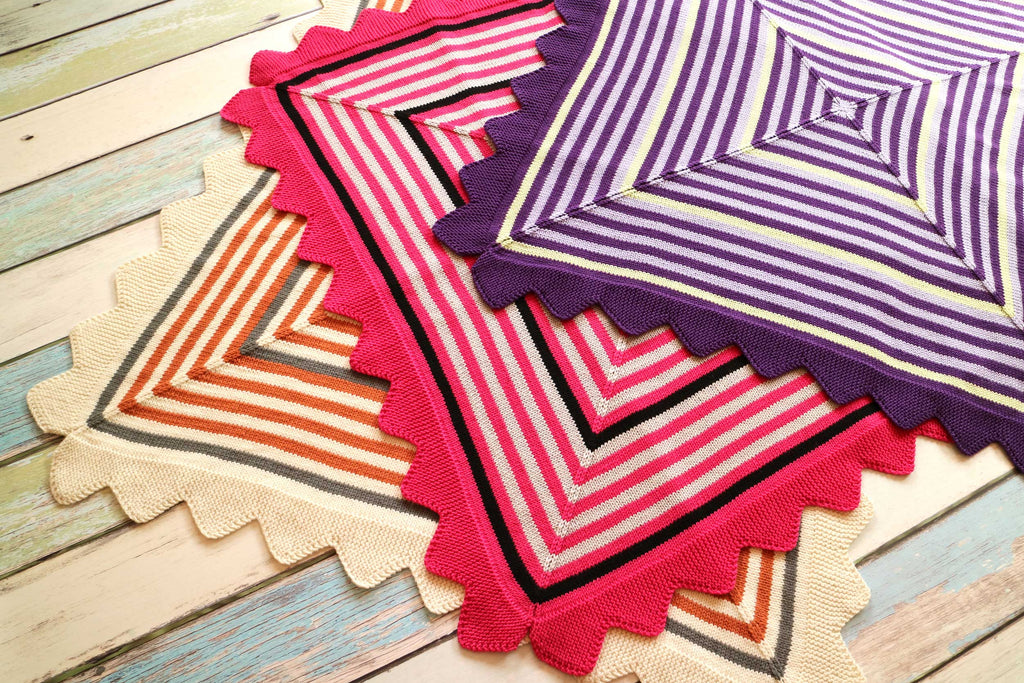 The zig zag edging is worked sideways, then the stitches for the wedge are picked up along the straight side edge and the easy four-row stocking stitch stripes begin. The fashioned decreasing worked along the sides creates an easy sewing edge, perfect for mattress stitch.